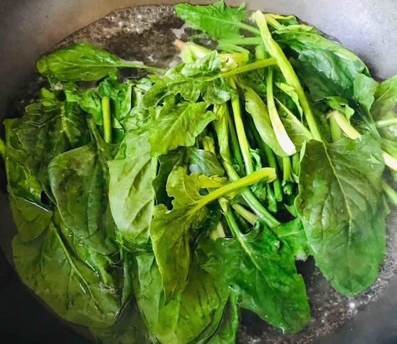 4,把菠菜摘去老叶清洗干净,放入锅中焯水后盛出备用,生姜切成丝备用。