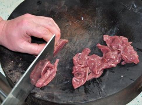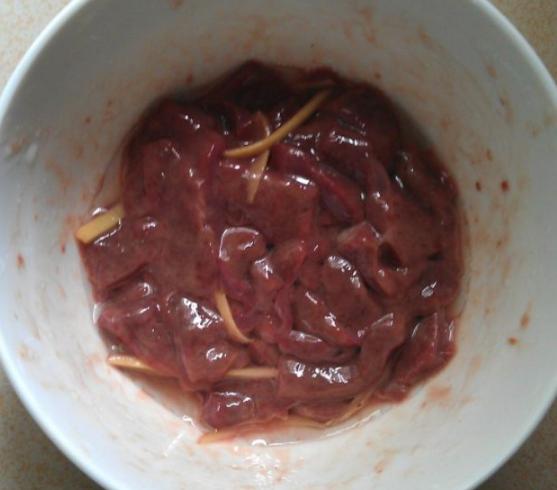 1,我们先把猪肝放在清水中浸泡一个小时左右,把血水浸泡出来,浸泡好了以后把猪肝的筋去掉,然后把它切成薄片。