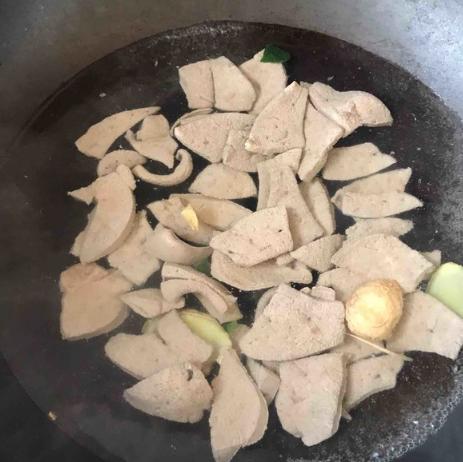3,锅中加入清水,烧开以后把猪肝倒入锅中焯水,当猪肝变色以后把它捞出来。