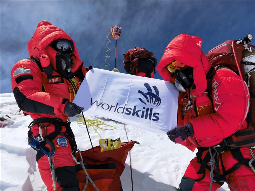 5月27日中午11时,世界技能会旗成功登顶珠峰并在峰顶展示,寓意技能问鼎世界之巅,体现了勇攀高峰的拼搏精神与精益求精的工匠精神,在世界技能运动发展史上留下了精彩的“中国印记”。