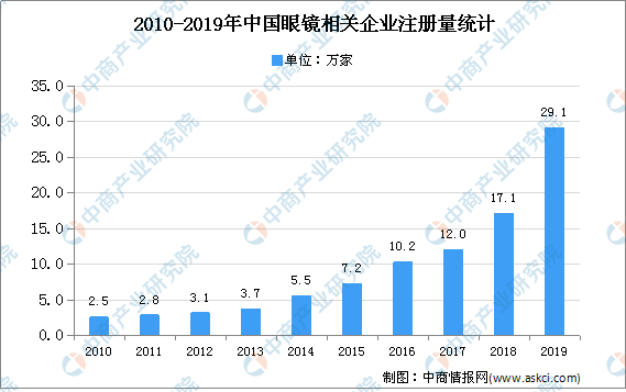 数据显示,全国范围内共有123万家眼镜相关企业,其中在业存续的有96万家。2010年-2019年全国眼镜相关企业注册量逐年攀升,得益于网络电商的发展以及人们对眼镜需求的日益增长,2014年后眼镜行业进入快速发展时期,至2018年,全国范围内眼镜相关企业注册量达17.1万家,是2017年注册量的1.4倍;2019年注册量已达到29.1万家,较2018年增长了70.2%。