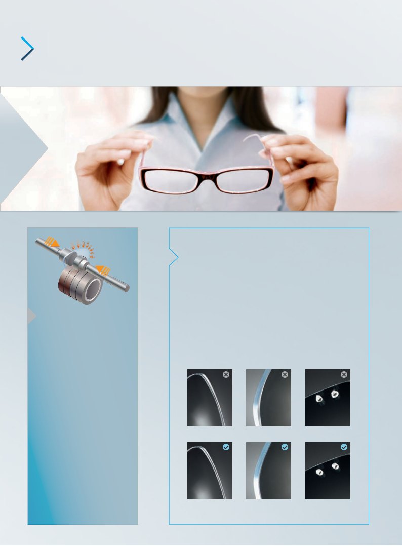 新的磨边辅助系统 (EAS) 避免了超滑膜镜片的轴位问题,并且确保了长方尖角的形状和易碎镜片的加工。