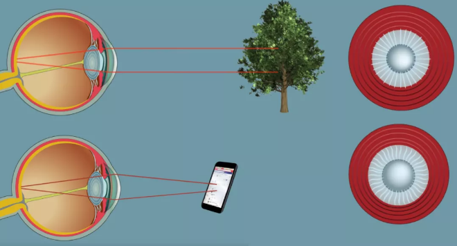 如果近眼,可以简单理解为整个眼球的屈光力增加,那么看近的时候,可以不动用调节反射或者比正常调节的更少,但内聚的角度和正常一样,这必然导致调节和内聚的不相协调;为了解决这个不协调,要么增加调节,要么减弱内聚,最终打破眼外肌之间原有的平衡,可能出现调节痉挛,尤其可能出现外隐斜,甚至会影响双眼视觉、立体视的发育。